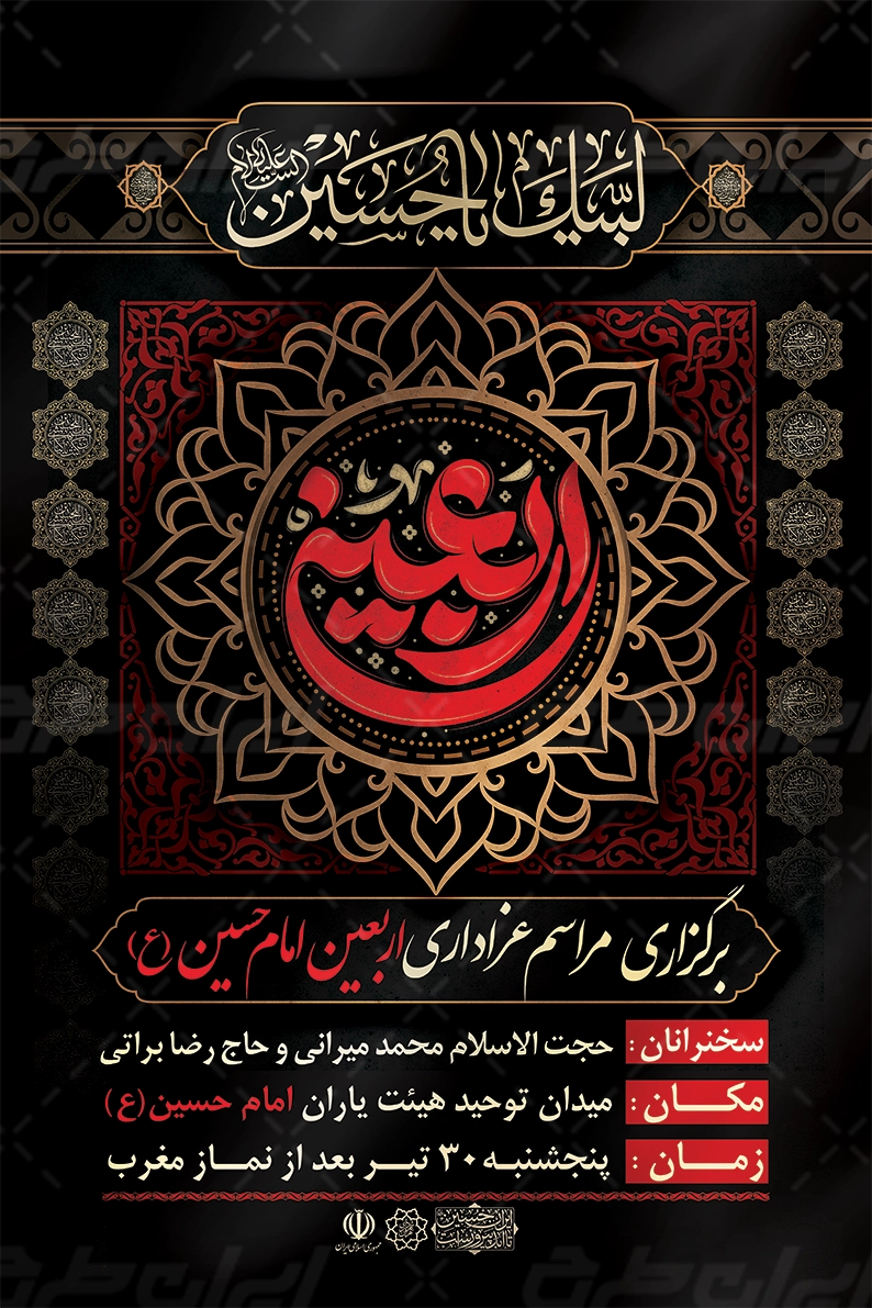 تذهیب و متن تسلیت اربعین حسینی می باشد که توسط طراحان ایران طرح در نرم افزار فتوشاپ طراحی شده است.