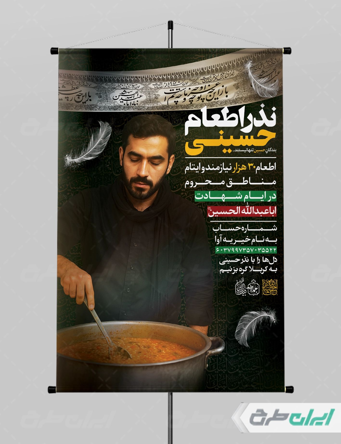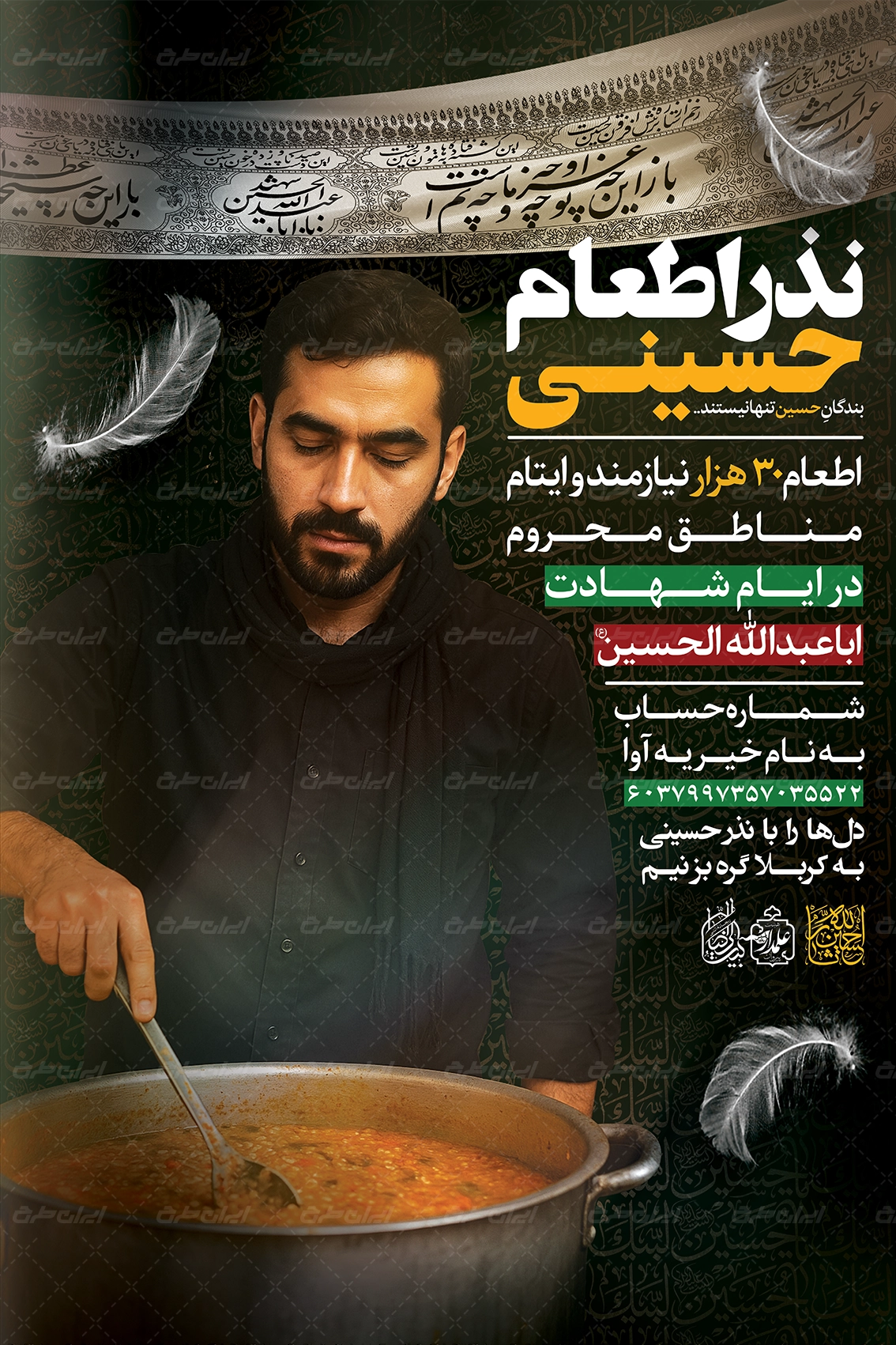 تصویر عزادار حسینی و دیگ نذری و متن تسلیت ایام محرم می باشد که توسط طراحان ایران طرح در نرم افزار فتوشاپ طراحی شده است.