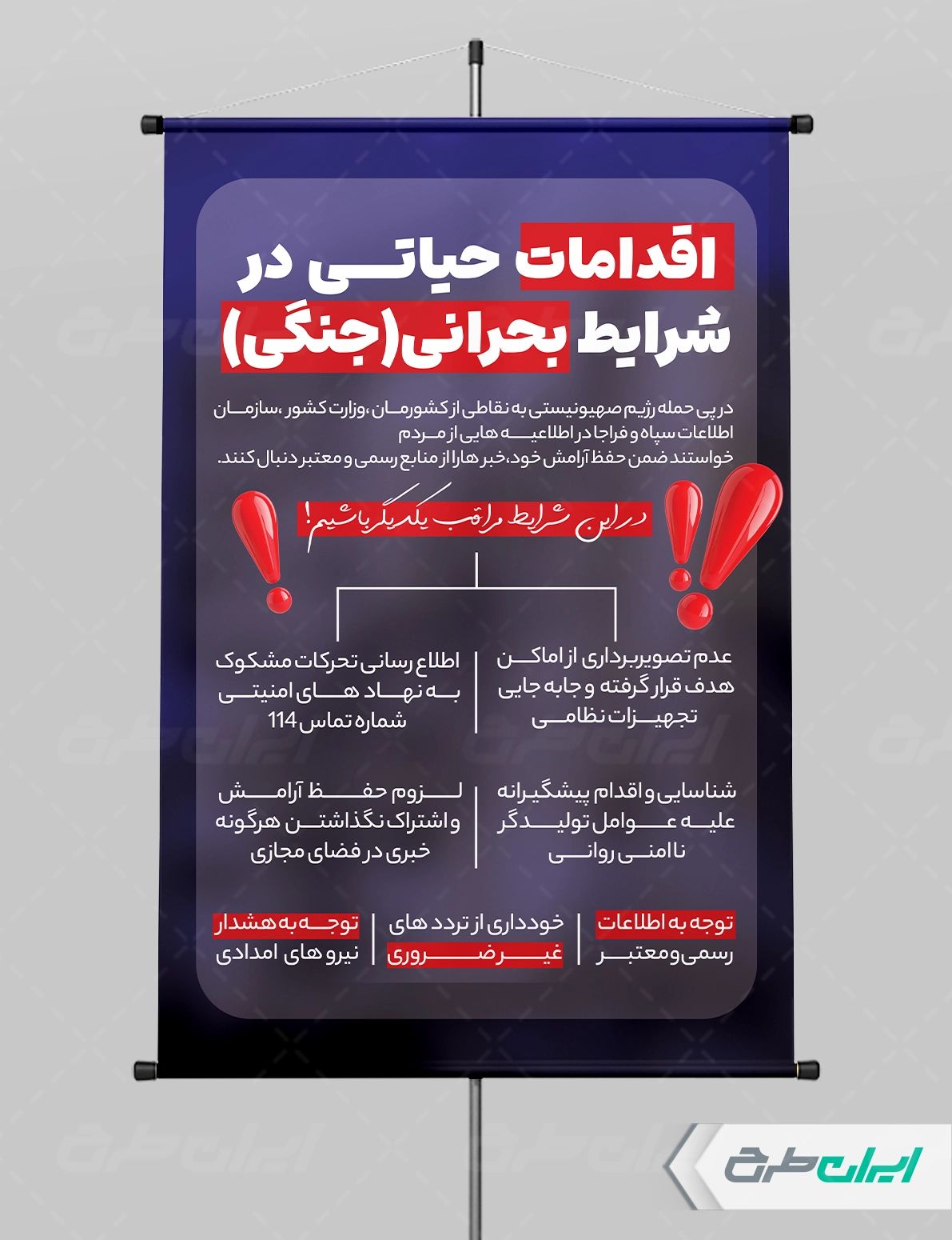 طرح بنر نکات عمومی شرایط جنگی توسط تیم ایران طرح طراحی و در دسترس کاربران سایت قرار گرفته است.