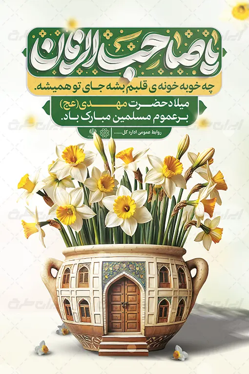 تصویر گل نرگس، تایپوگرافی یا صاحب الزمان و متن تبریک ولادت امام مهدی می باشد که توسط تیم ایران طرح طراحی شده است.