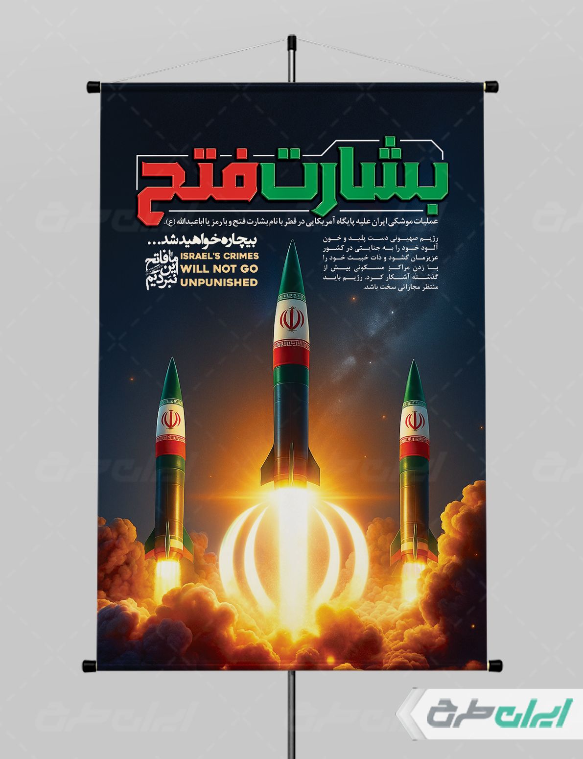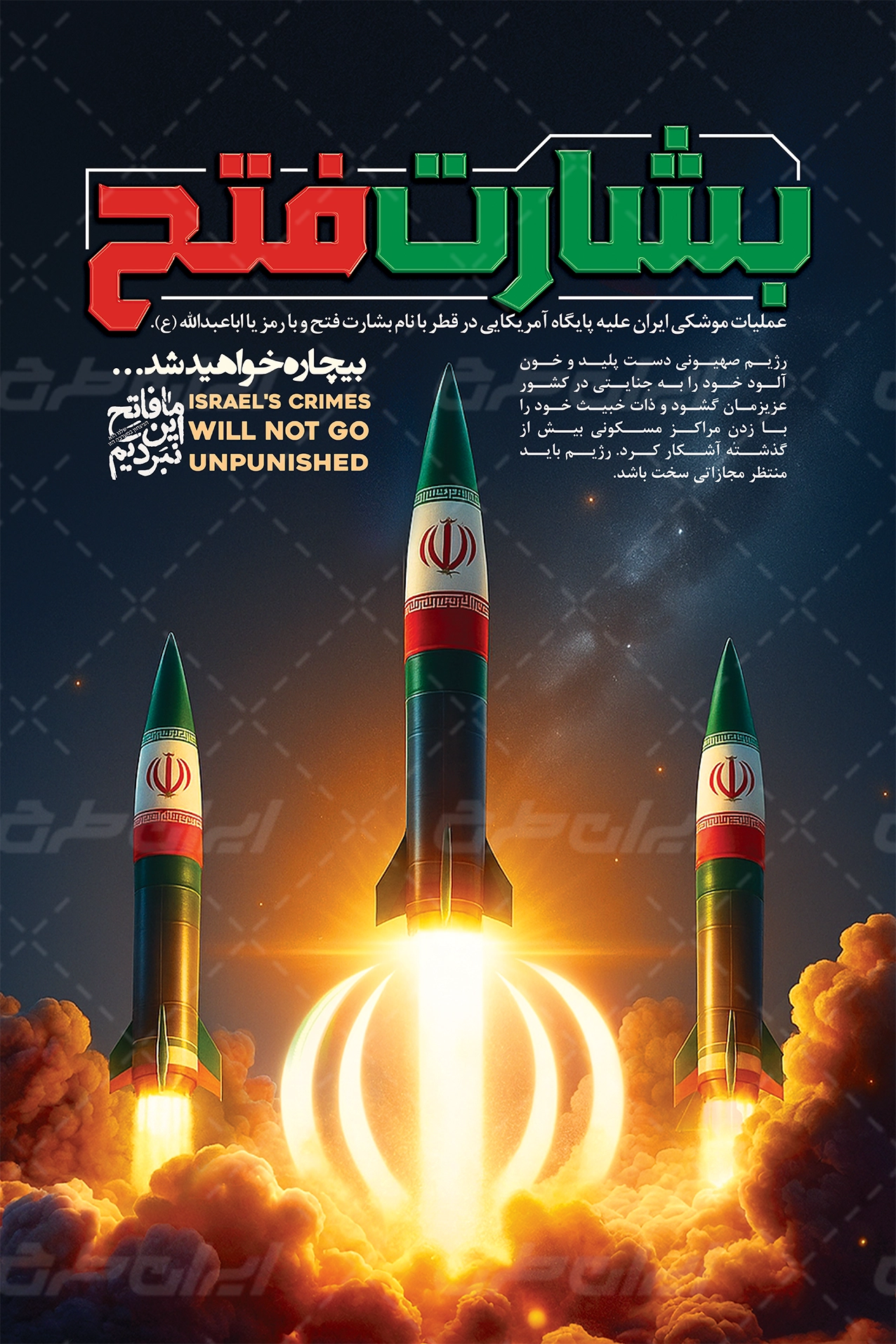 تایپوگرافی بشارت فتح و متن مرتبط با این حمله موشکی است که توسط تیم خلاق ایران طرح طراحی شده است.