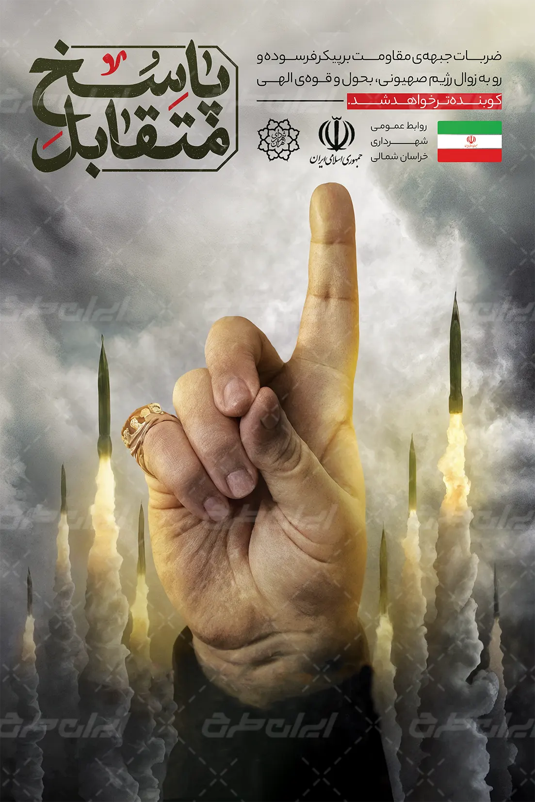 تصویر موشک و متن مرتبط با این حمله موشکی است که توسط تیم خلاق ایران طرح طراحی شده است.