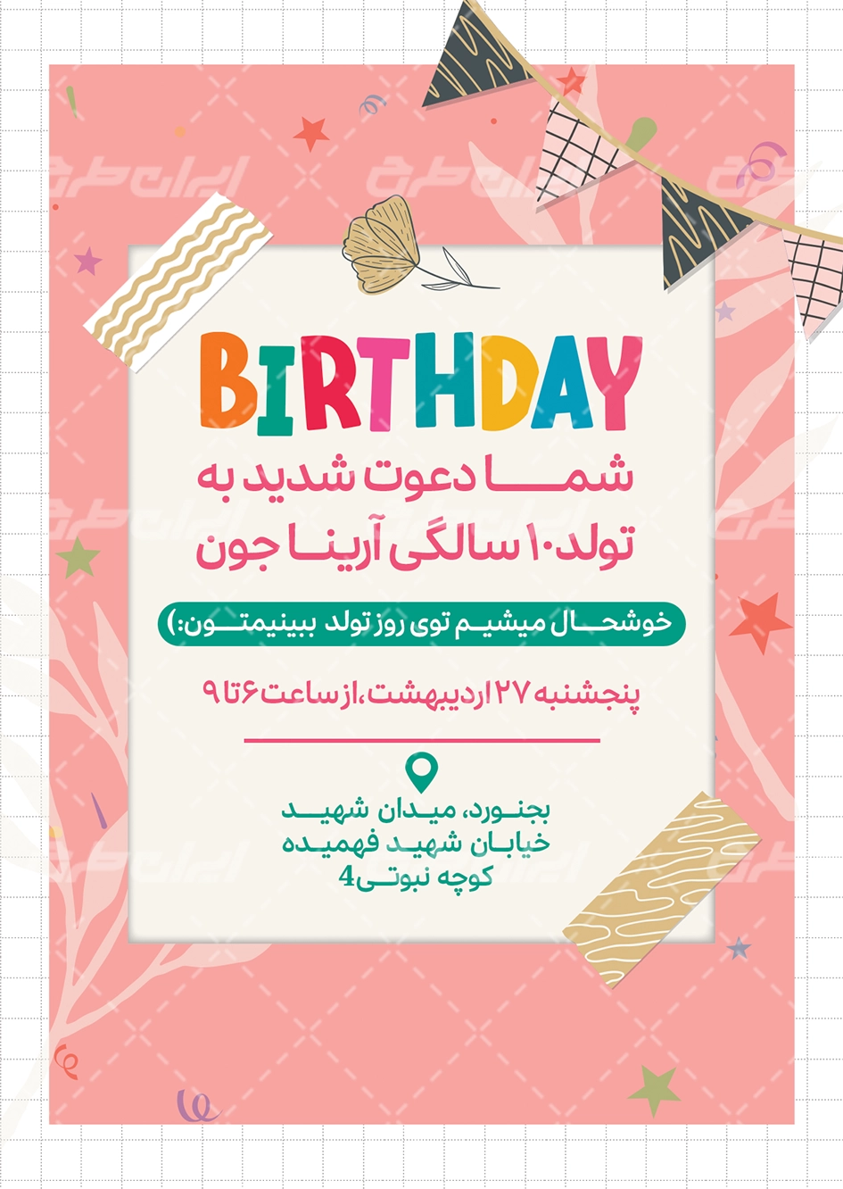 طرح جشن تولد و متن دعوت جشن تولد می باشد که توسط طراحان ایران طرح در نرم افزار فتوشاپ طراحی شده است.