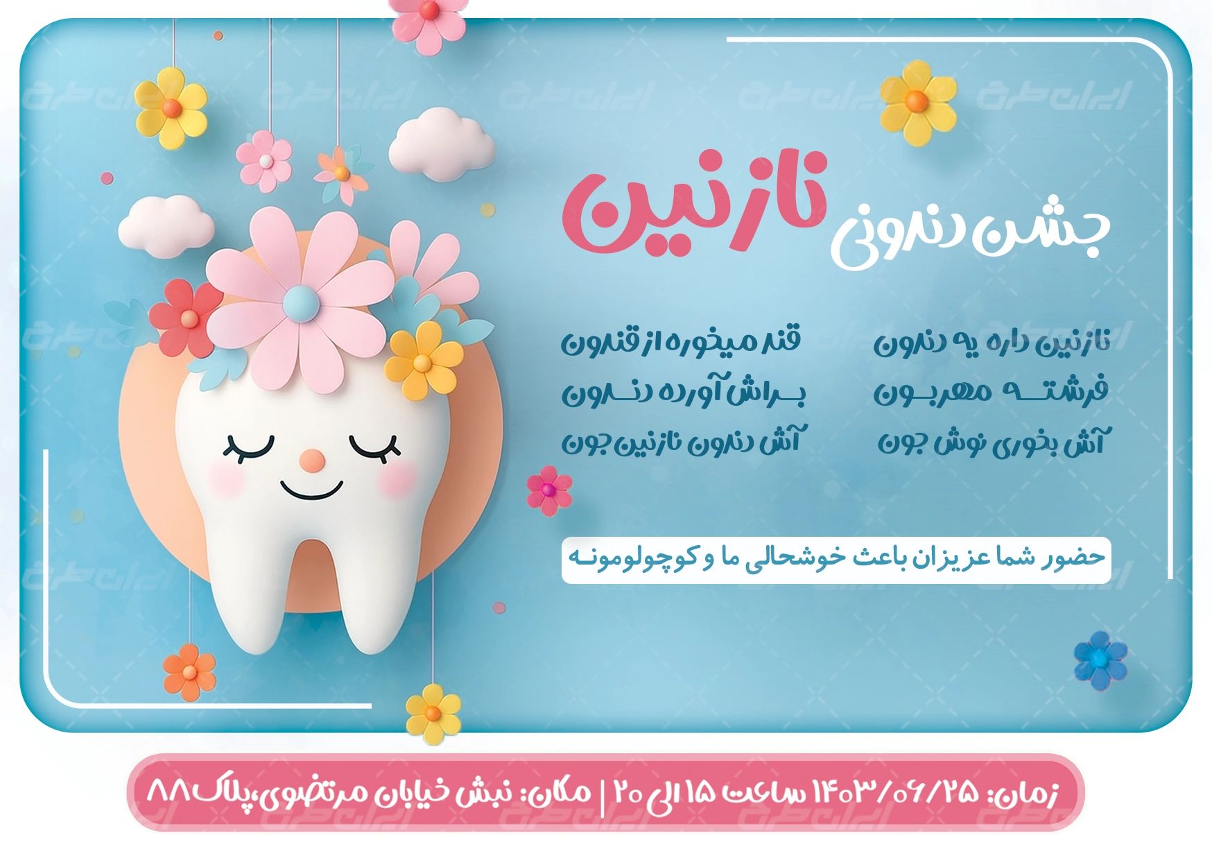 طرح دندون و متن دعوت جشن دندونی می باشد که توسط طراحان ایران طرح در نرم افزار فتوشاپ طراحی شده است.