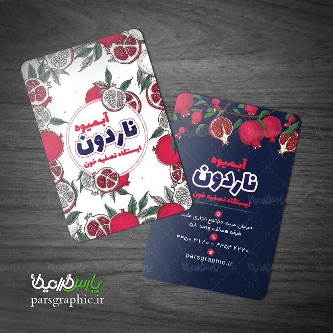 طرح کارت ویزیت لایه باز آب انار فروشی با پسوند psd طراحی شده و در نرم افزار فتوشاپ قابل ویرایش می باشد .