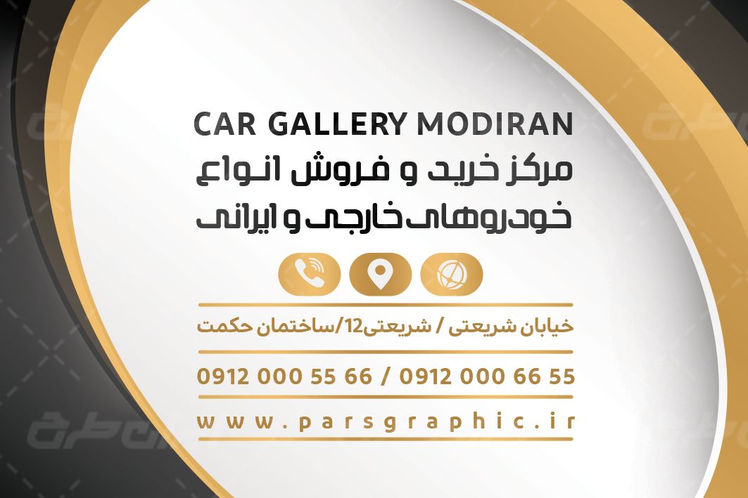 طرح کارت ویزیت نمایشگاه اتومبیل در پس زمینه رنگ های مشکی طلایی سفید طراحی شده و از تصویر باکیفیت اتومبیل استفاده شده است .