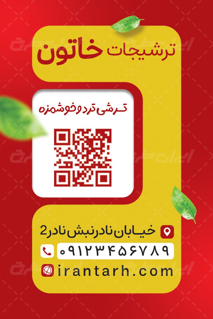 طرح لایه باز کارت ویزیت فروشگاه ترشیجات، جهت بازاریابی و تبلیغات این دسته از فروشگاه ها توسط تیم طراحان ایران طرح طراحی و در دسترس کاربران سایت قرار گرفته است.