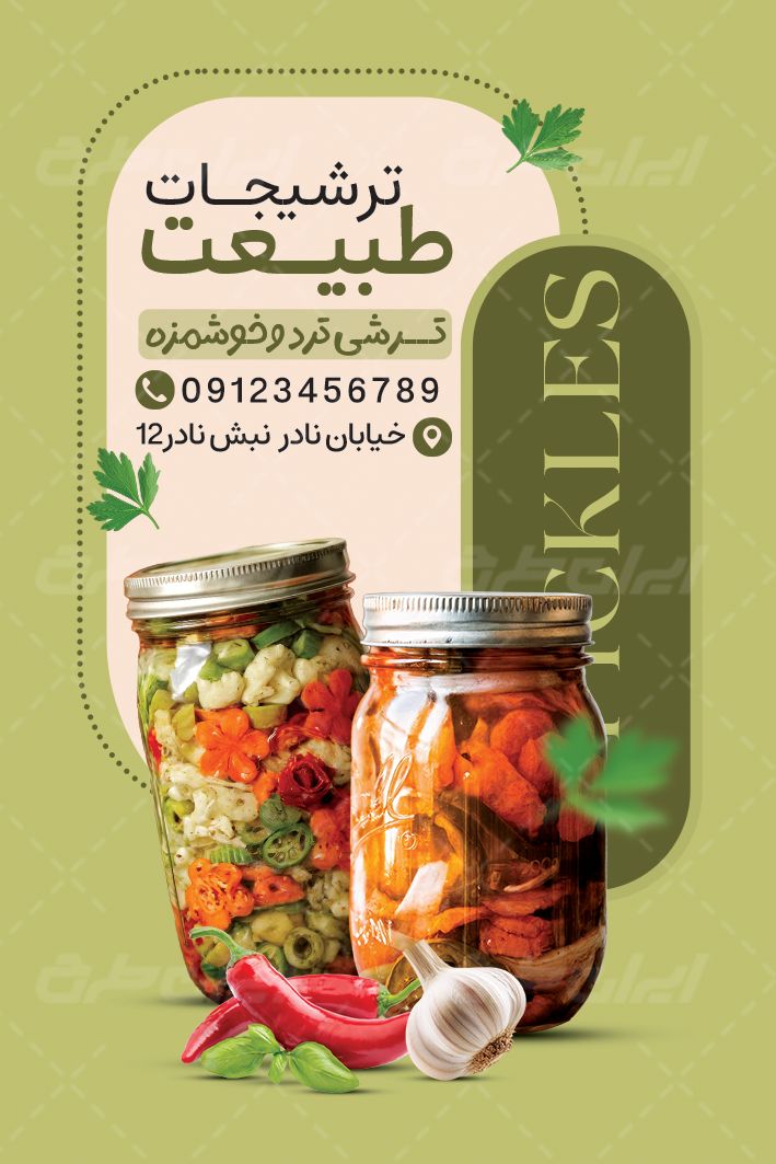 طرح لایه باز کارت ویزیت فروشگاه ترشیجات، جهت بازاریابی و تبلیغات این دسته از فروشگاه ها توسط تیم طراحان ایران طرح طراحی و در دسترس کاربران سایت قرار گرفته است.