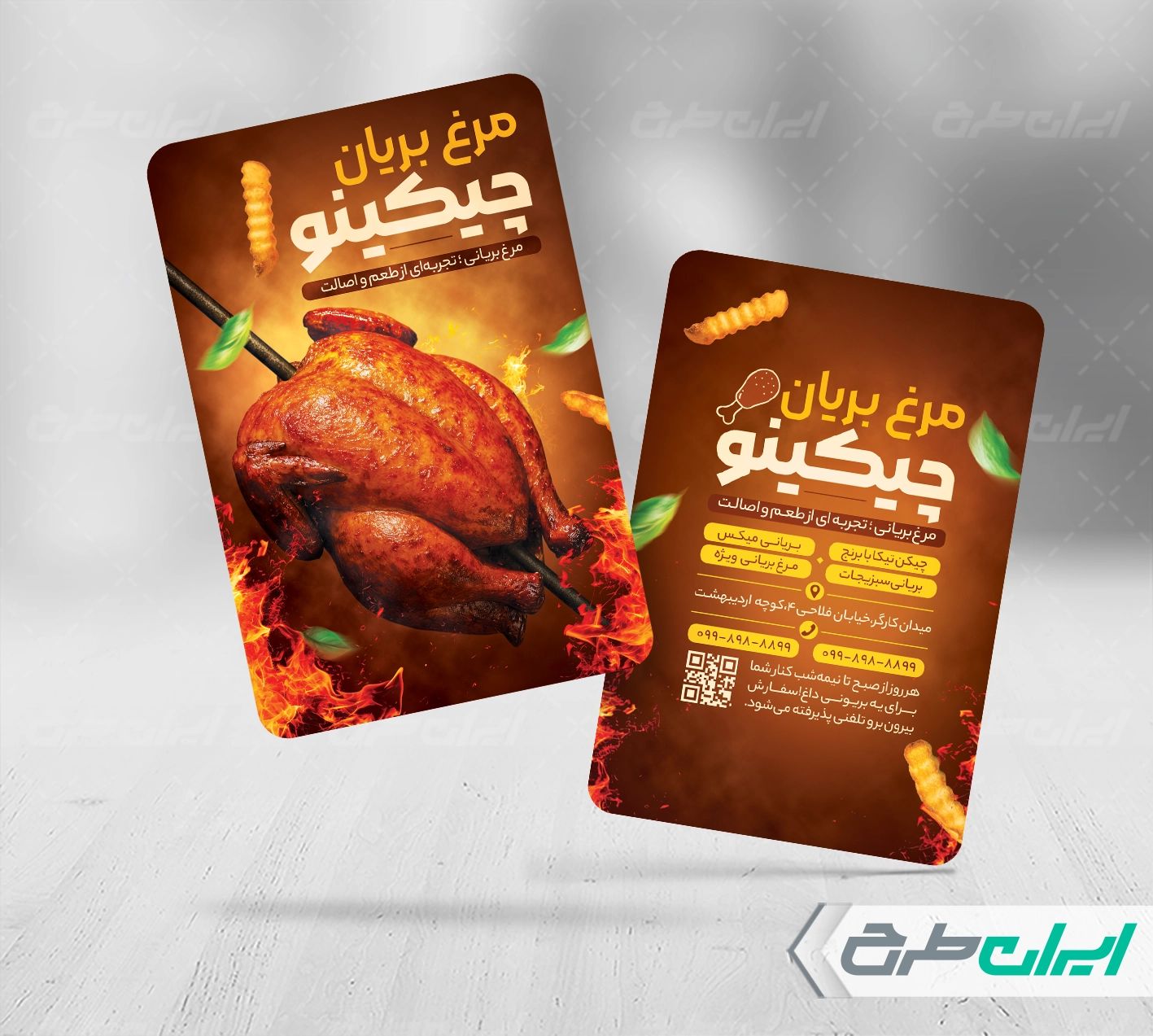 طرح کارت ویزیت لایه باز مرغ بریان، توسط تیم ایران طرح برای بازاریابی و تبلیغات این فروشگاه طراحی شده است.