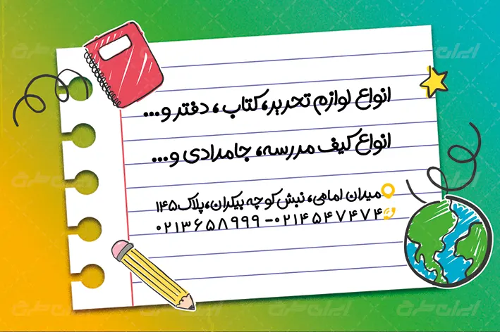طرح کارت ویزیت فروشگاه لوازم تحریر، توسط تیم ایران طرح جهت تبلیغات و بازاریابی این دسته از فروشگاه ها طراحی شده است.
