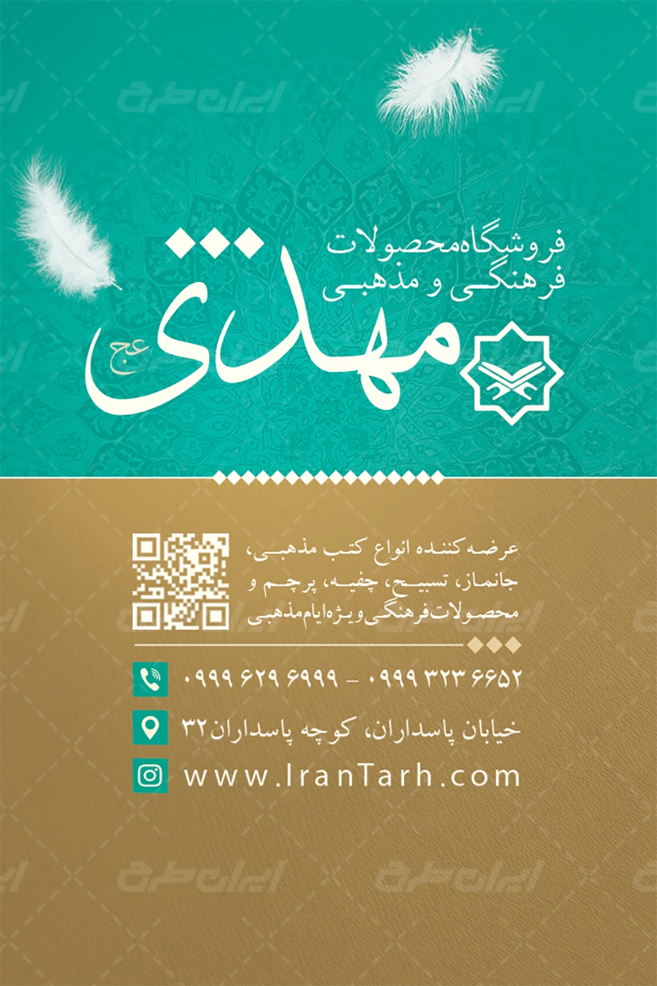 طرح کارت ویزیت فروشگاه محصولات فرهنگی مذهبی توسط تیم ایران طرح جهت تبلیغات و بازاریابی این دسته از مشاغل طراحی و در دسترس کاربران سایت قرار گرفته است.