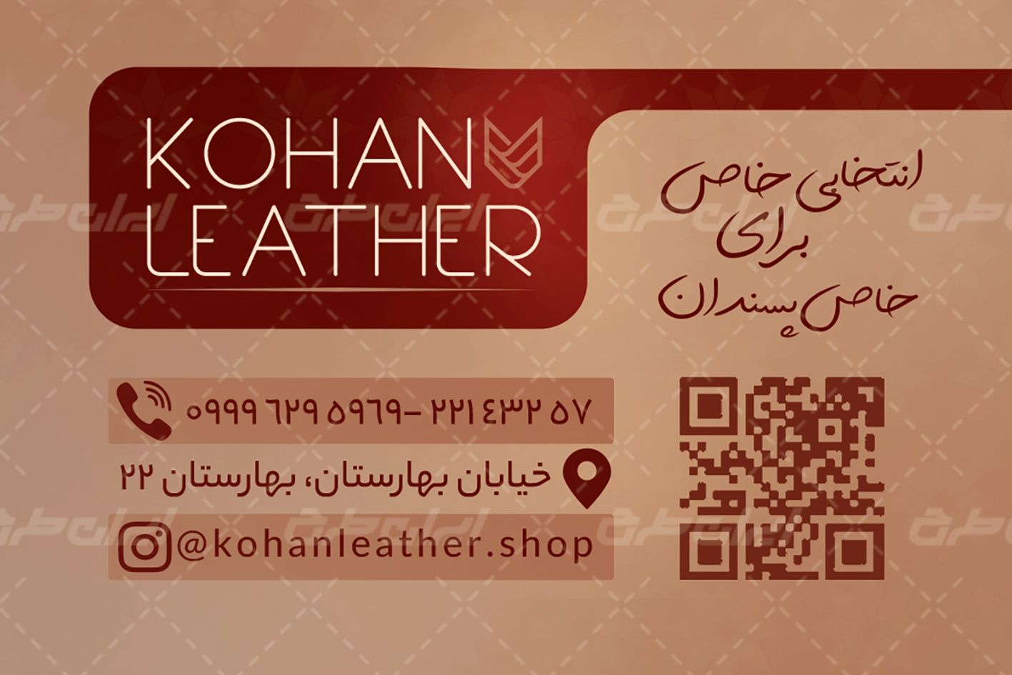 - طراحی شیک و فانتزی کارت ویزیت که مناسب شغل گالری محصولات چرمی می باشد.