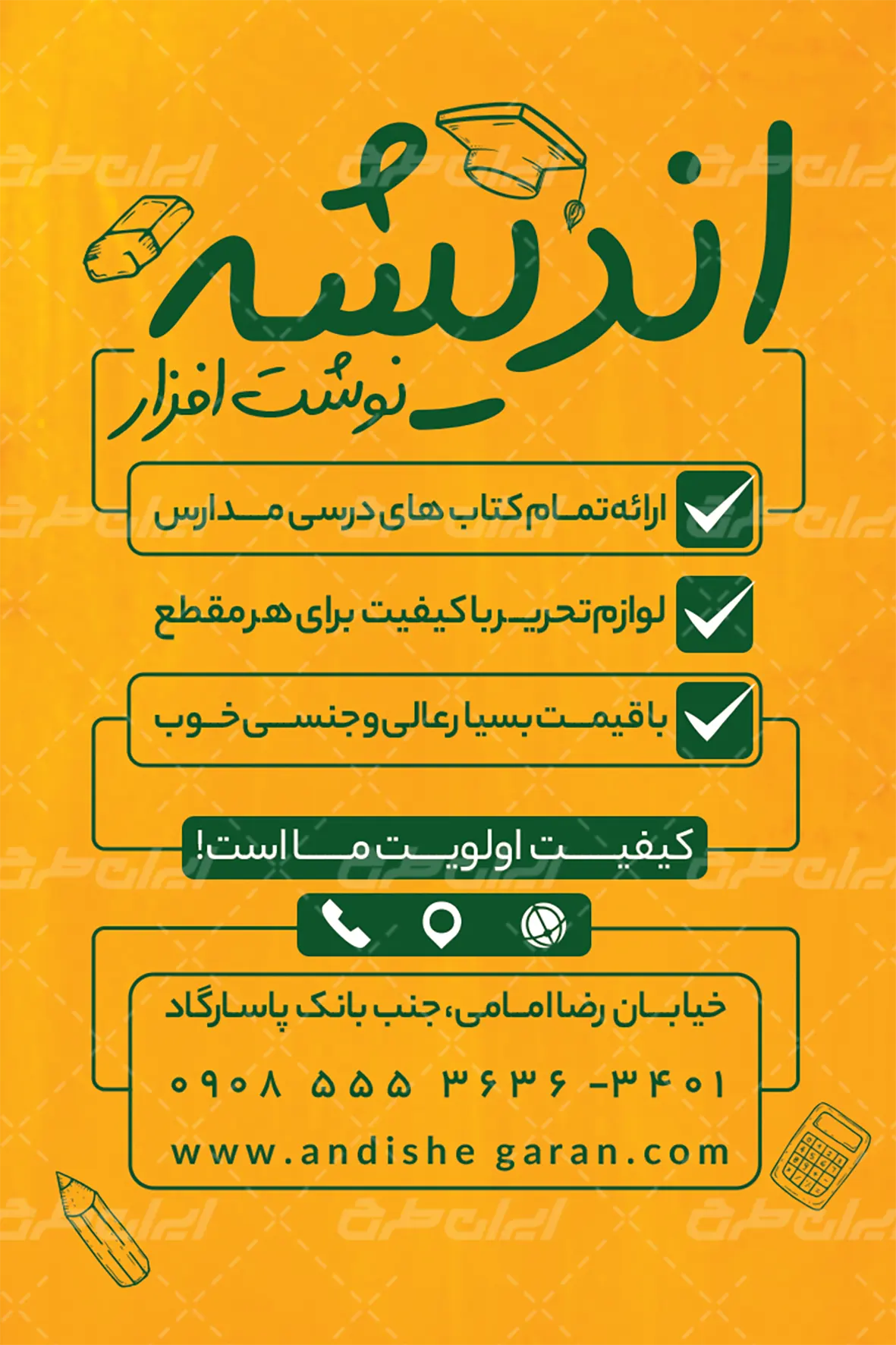 طرح کارت ویزیت فروشگاه لوازم تحریر، توسط تیم ایران طرح جهت تبلیغات و بازاریابی این دسته از فروشگاه ها طراحی شده است.
