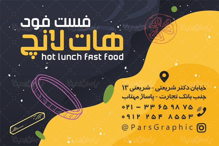 طرح کارت ویزیت فست فود شامل: وکتور ، لیبل و شیپ های کاربردی می باشد که توسط طراحان پارس گرافیک در نرم افزار فتوشاپ طراحی شده است. به دلیل لایه باز بودن (قابل ویرایش توسط کاربران در نرم افزار فتوشاپ Adobe Photoshop) بودن و کیفیت بالای عناصر و المان های استفاده شده در طرح، می توانید از این طرح علاوه بر چاپ کارت ویزیت(به صورت افقی و دورو)، از سایر موارد تبلیغاتی از جمله نصب روی بیلبورد، استوری اینستاگرام و دیگر پلت فرم های فضای مجازی بهره ببرید. طرح بدون تغییر سایز مناسب چاپ کارت ویزیت لمینت و با تغییر جزئی سایز مناسب چاپ کارت ویزیت براق، کارت ویزیت کتان و کارت ویزیت مات و دیگر کارت ویزیت ها نیز می باشد.