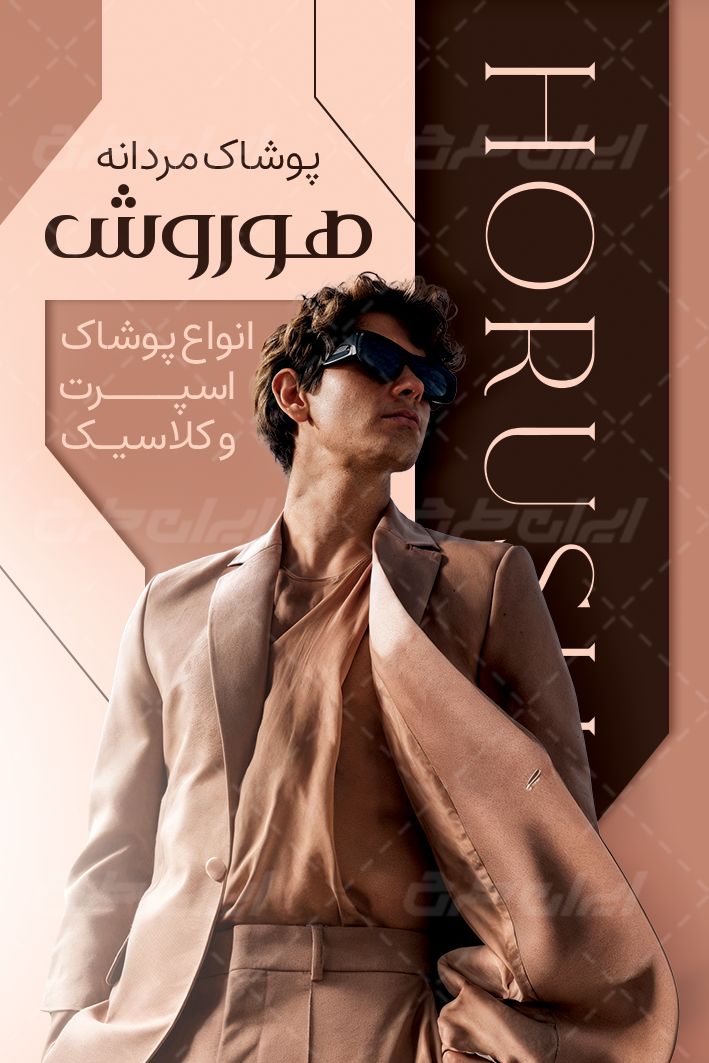 استفاده از عکس با کیفیت لباس مردانه و لیبل و شیپ ها و المانهای کاربردی می باشد که توسط طراحان ایران طرح در نرم افزار فتوشاپ به صورت بسیار زیبا و فانتزی طراحی شده است.