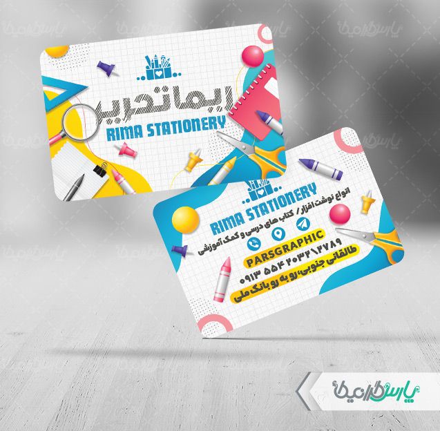 طرح کارت ویزیت فروشگاه نوشت افزار، توسط تیم پارس گرافیک جهت تبلیغات و بازاریابی این دسته از فروشگاه ها طراحی شده است.