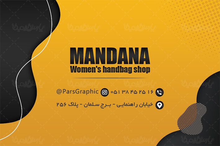 طرح کارت ویزیت فروشگاه کیف و محصولات چرمی با پس زمینه مشکی و زرد و بصورت افقی طراحی شده است