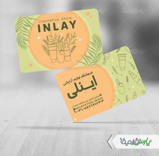 طرح کارت ویزیت بصورت افقی و دورو مناسب برای فروشگاه لوازم آرایشی و بهداشتی طراحی شده است .