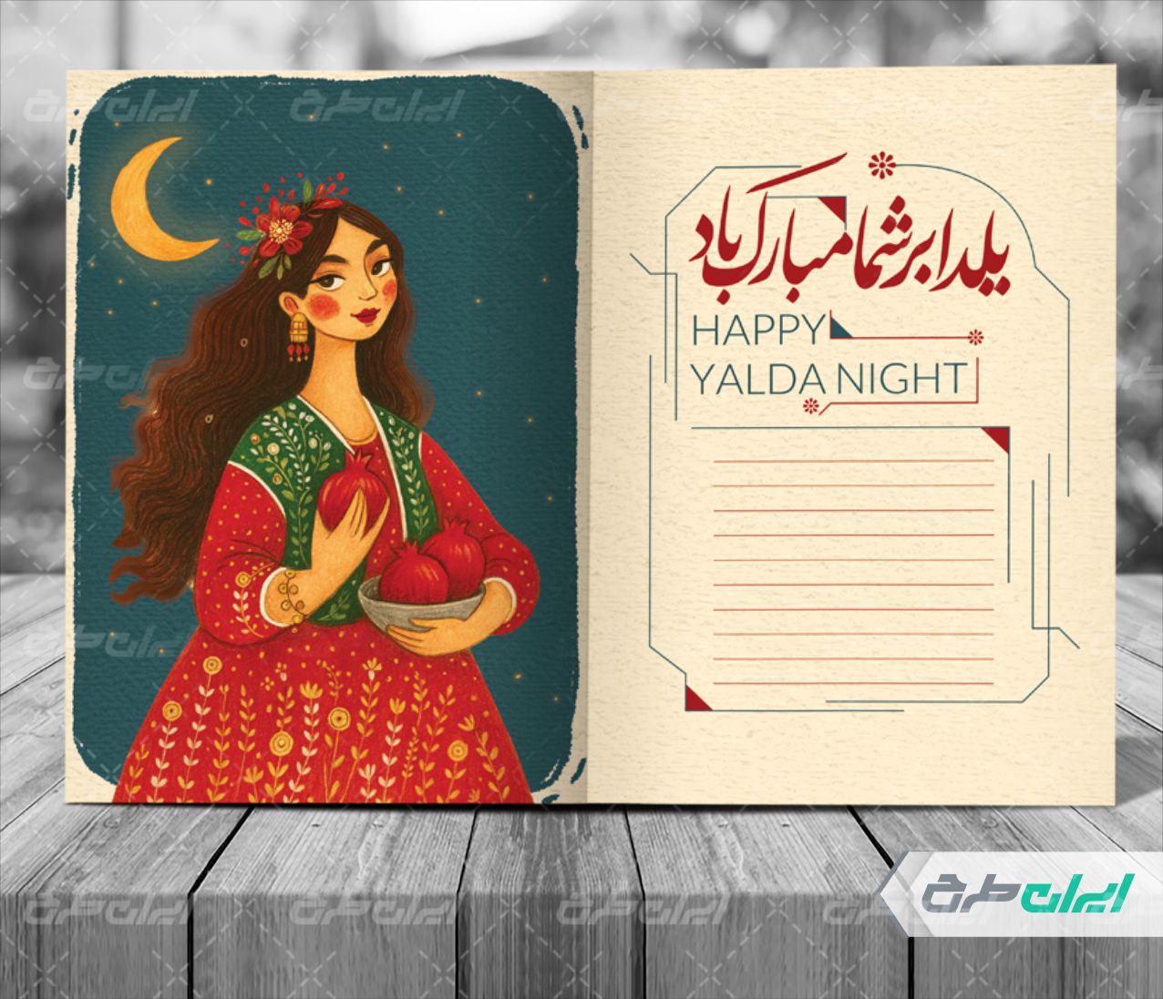 طرح کارت پستال یلدا در نرم افزار فتوشاپ به صورت لایه باز طراحی شده و شامل :