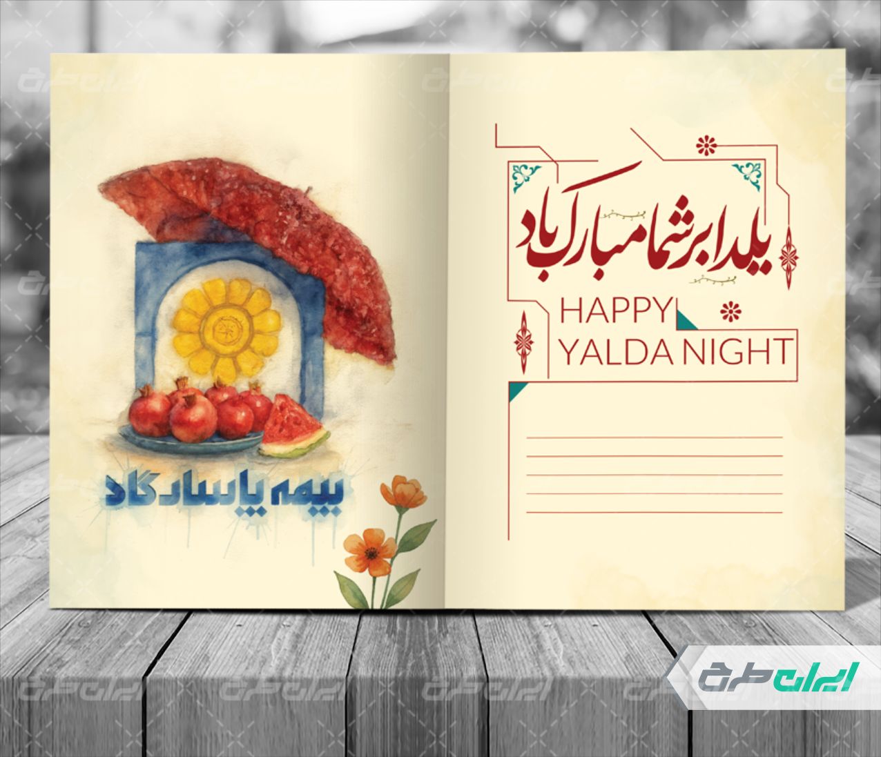 طرح کارت پستال یلدا در نرم افزار فتوشاپ به صورت لایه باز طراحی شده و شامل :