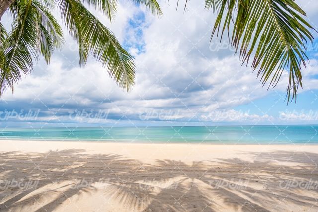تصویر با کیفیت ساحل دریا همراه با آسمان ابری و دریای آرام