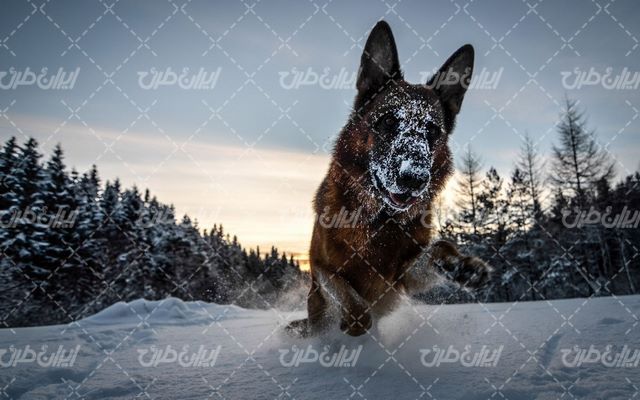 تصویر با کیفیت سگ به همراه حیوان و منظره زیبای فصل زمستان