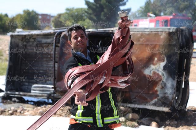 عکس با کیفیت مانور اطفاء حریق آتش نشانی.