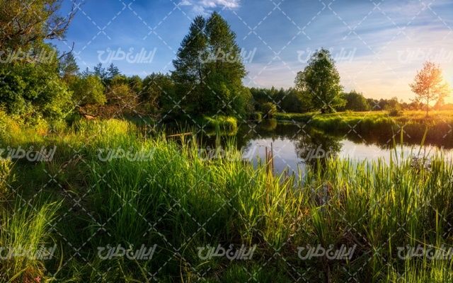 تصویر با کیفیت منظره زیبای رودخانه همراه با غروب آفتاب و درخت