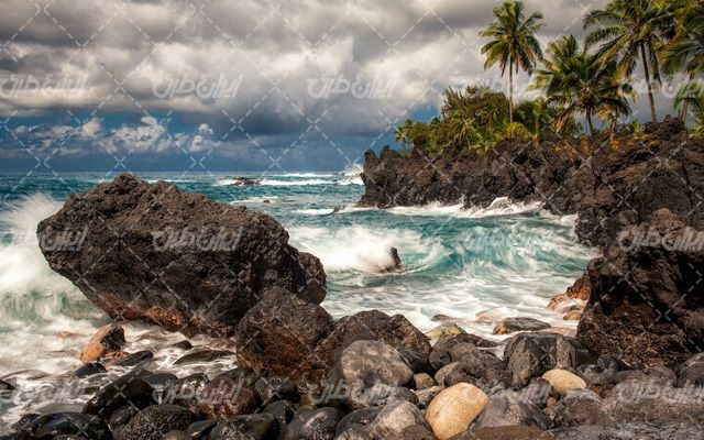 تصویر با کیفیت منظره زیبای ساحل سنگی همراه با موج دریا و آسمان آبی
