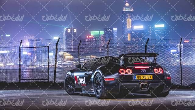 تصویر با کیفیت نمایشگاه خودرو به همراه خودروی اسپرت و آسمان خراش
