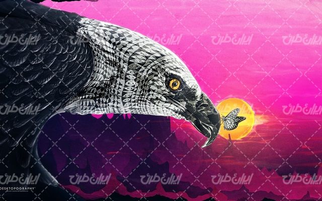 تصویر با کیفیت پرنده شکاری به همراه پروانه زیبا و ماه کامل