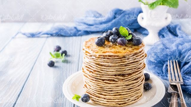 تصویر با کیفیت پنکیک همراه با میوه استوایی و میان وعده