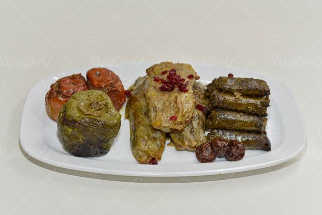 در تصویر بالا از دلمه برگ و فلفل دلمه و گوجه استفاده شده است.