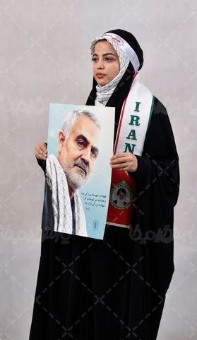 در این تصویر از خانم ایرانی با پرچم در راهپیمایی استفاده شده است.