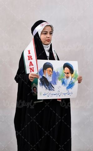 در این تصویر از خانم ایرانی با عکس رهبر معظم انقلاب اسلامی ایران استفاده شده است.