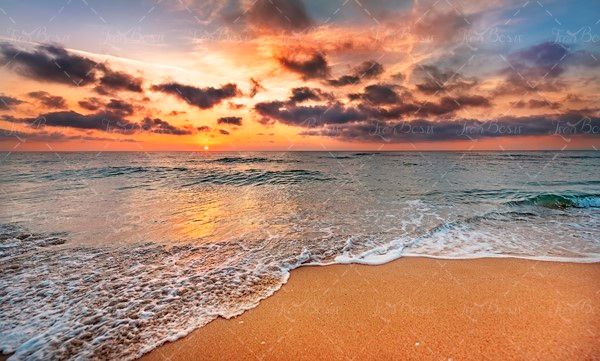 توضیحات : ساحل شنی خورشید غروب دریا منظره طبیعت چشم انداز