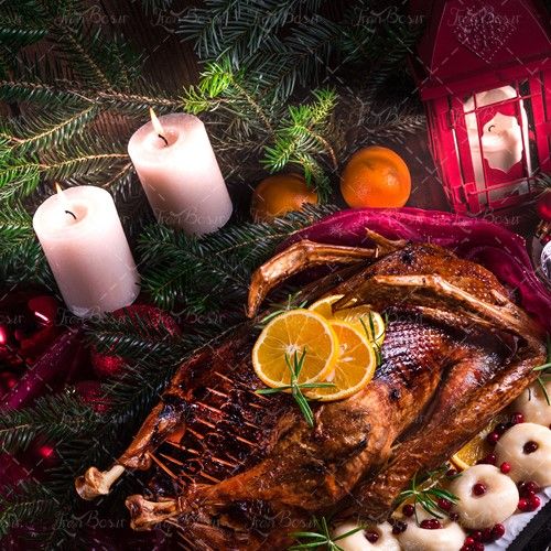توضیحات : شمع سفره خانه سنتی مرغ بریان با تزئین پرتقال مرغ شکم پر رستوران آشپزخانه تهیه غذا