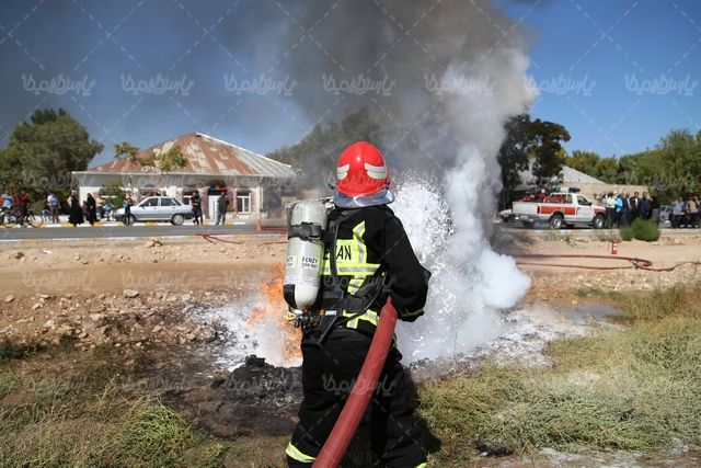 عکس با کیفیت مانور اطفاء حریق آتش نشانی.