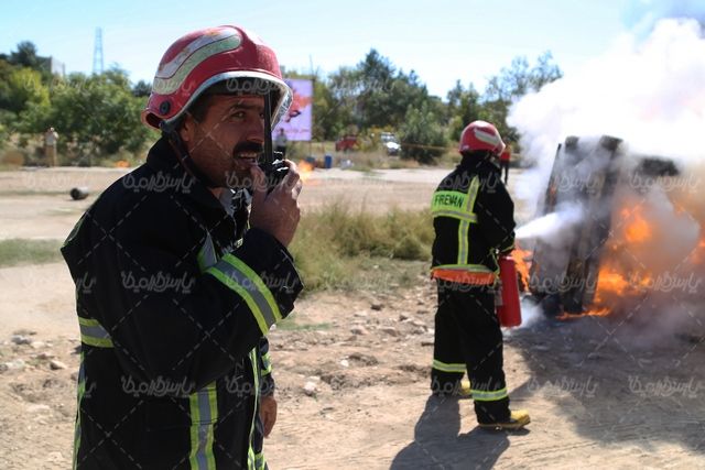 عکس با کیفیت مانور اطفاء حریق آتش نشانی.