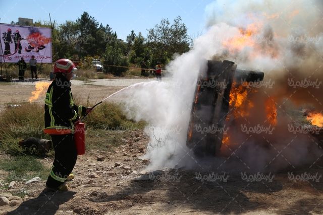 تصویر با کیفیت مانور اطفاء حریق آتش نشانی.