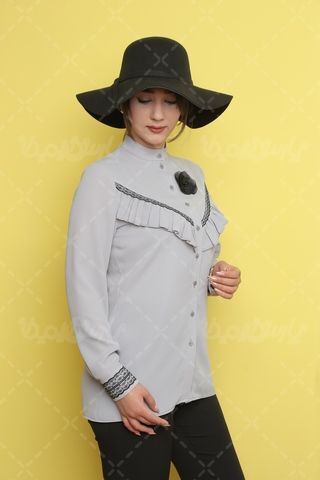 در این تصویر از شومیز طوسی زنانه استفاده شده است.