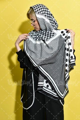 در تصویر بالا شال طرحدار سفید و سیاه را مشاهده میکنید.