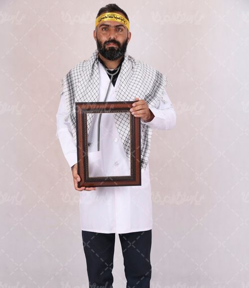 در این تصویر از مرد پزشک همراه قاب عکس استفاده شده است.