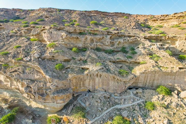 در تصویر بالا از غارهای سه گانه بان مسیتی یا تیس یکی از جاذبه های گردشگری چابهار ، سیستان و بلوچستان استفاده شده است.