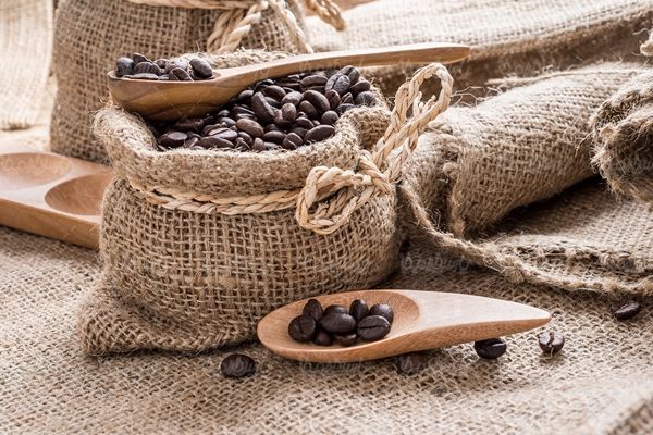 قاشق چوبی , قهوه فرآوری شده , قهوه , کیسه گونی قهوه , دانه های قهوه ,