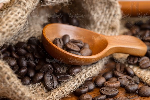 کیسه گونی قهوه , قهوه فرآوری شده , دانه های قهوه , قهوه , قاشق چوبی ,