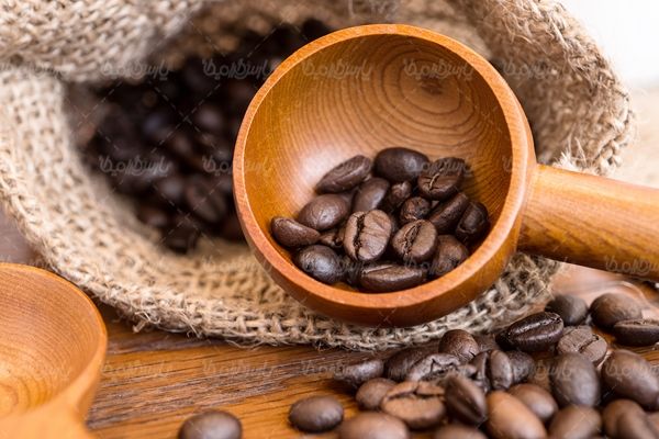 دانه های قهوه , قهوه , قهوه فرآوری شده , کیسه گونی قهوه , قاشق چوبی ,