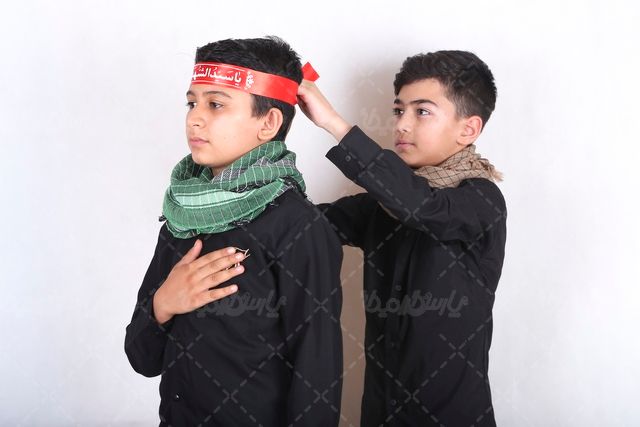 در تصویر بالا از پسر با لباس مشکی با چفیه استفاده شده است.