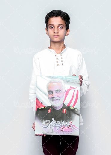 در این تصویر از پسر بچه با قاب عکس شهید قاسم سلیمانی استفاده شده است.