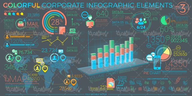 در این فایل Illustrator ،اینفوگرافی و اینفوگرافی رنگی نیز وجود دارد که قابل استفاده در طرح کارت ویزیت ، طرح بنر و دیگر طرح های گرافیکی و تبلیغاتی می باشد